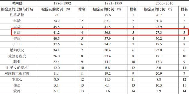 有学者对1985-2000年女性在《中国妇女》杂志上刊登的征婚启事进行了统计,按照每5年抽取1年为取样原则,一共获得了131份女性征婚启事样本。数据发现,从1985年-2000年,男人的身高一直都是女人择偶的一项标准,而且排名不低,1996年之前一直都排在前三位。