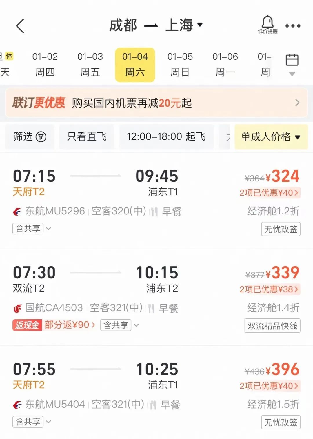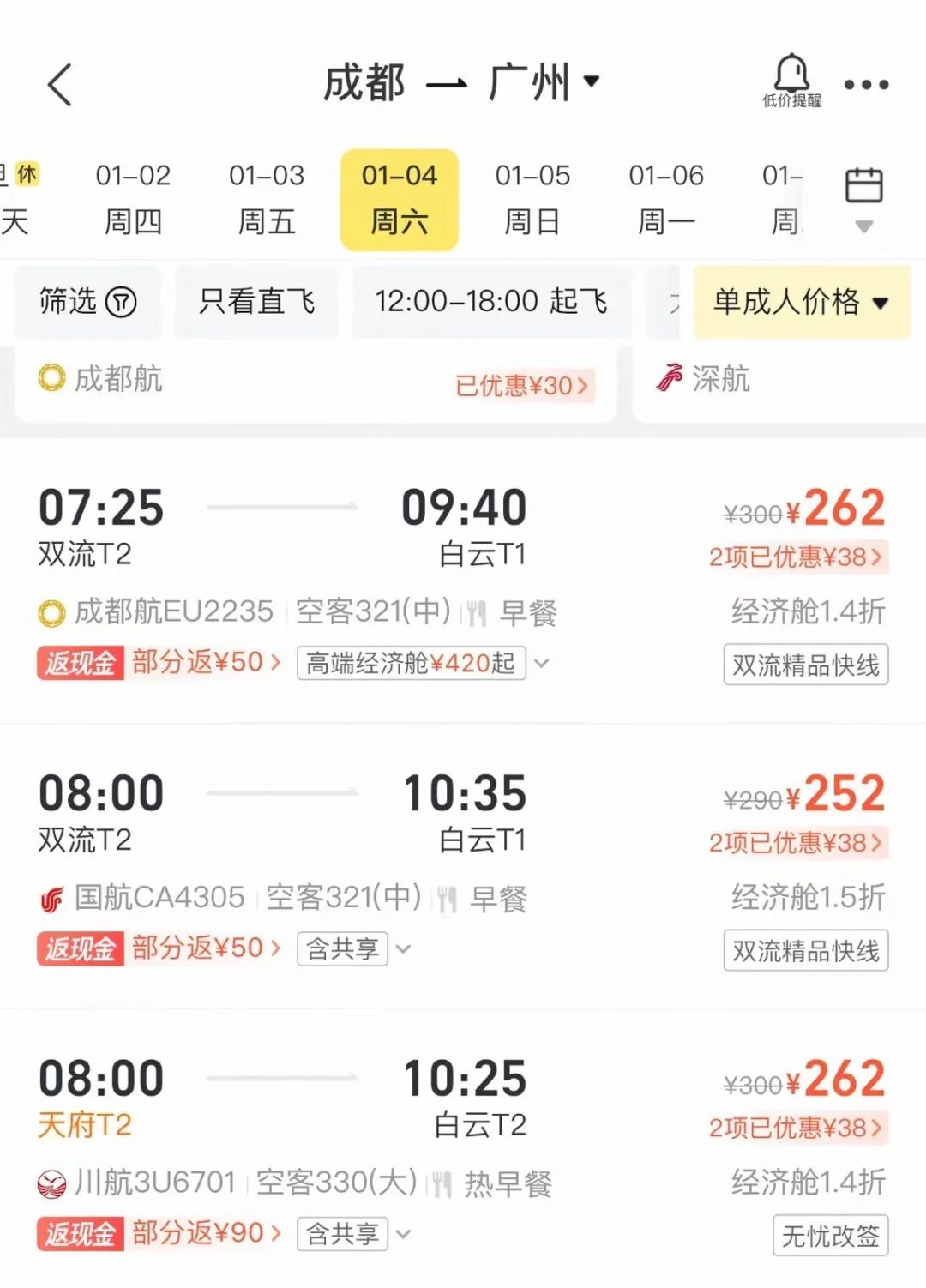 对此,各平台纷纷为消费者省钱买机票出谋划策:反向买、错峰买、提前买更划算。例如,春节假期前一周,从西安、成都、重庆、郑州等地飞往广州、深圳的机票价格普遍在3折左右,均价基本在600元以内,性价比较高。